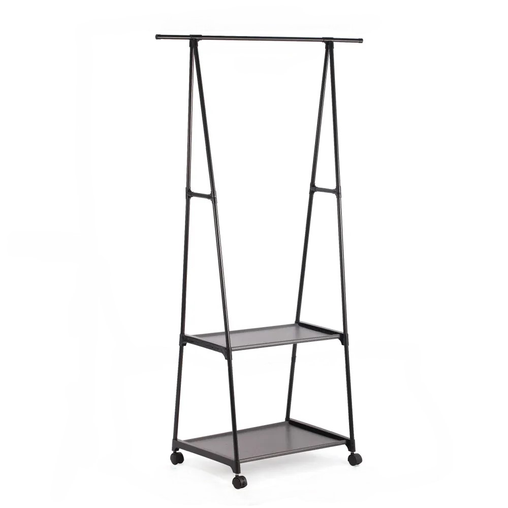 Стойка для одежды мобильная за счет колесиков – ее можно легко перемещать по квартире или поставить на блокировку при необходимости. Материал колесиков не царапает пол и не вредит покрытию. Две нижние полки оптимально подходят для хранения домашнего текстиля, коробок-органайзеров, обуви, сумок. Вместительная вешалка для одежды выдерживает большое количество легких вещей на плечиках.