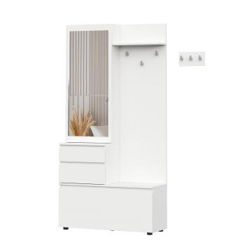 “Вешалка Одри выполняет весь необходимый функционал в прихожей. Модуль содержит в себе двухсекционную обувницу для хранения обуви разной высоты, два выкатных ящика для аксессуаров и различных мелочей, декорированный зеркальной створкой пенал. Хранить верхнюю одежду удобно на открытых хромированных крючках.