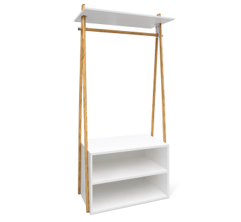 Современная и стильная компакт-прихожая оборудована открытой штангой-вешалкой и обувницей, состоящей из двух полок. На верхнюю часть обувницы можно поставить сумки, положить перчатки и необходимые мелочи. Вешалка-штанга стилизована под изгиб живого дерева и покрыта пленкой PVC имитирующей натуральную текстуру. Компакт-прихожая прекрасно дополнит Ваш стильный интерьер и позволит с удобством хранить верхнюю одежду, обувь и аксессуары. Сочетание светлого ЛДСП и текстуры дерева, а также оригинальный декор создадут модную атмосферу.