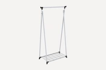 Функциональная складная гардеробная вешалка укомплектована штангой (796 мм) для вешалок-плечиков и полкой (730х406 мм) для обуви, крючками для сумок и пакетов. Вешалка выполнена из металлической трубы, прутка и пластиковой фурнитуры. Порошковая окраска изделия, стойкая к механическим повреждениям. Ширина штанги позволяет вместить до 25 вешалок-плечиков.
