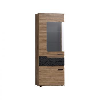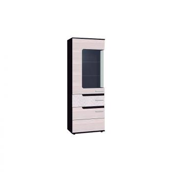 WYSPAA 1 Витрина высокая – оригинальный модуль, в стиле большого города: лаконичный дизайн, угловое остекление фасадов, глянцевые вставки из МДФ с объемным рисунком, яркая фурнитура. Угловое остекление фасада увеличивает обзор содержимого витрины. Стеклянные дверцы плотно закрываются благодаря магнитным защелкам. Все стеклянные поверхности с еврокромкой. Фасады не перенавешиваются, задняя стенка обеих Витрин врезная.