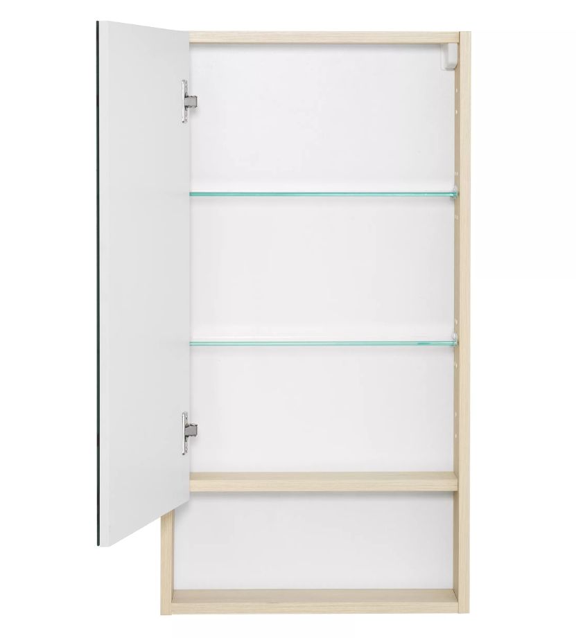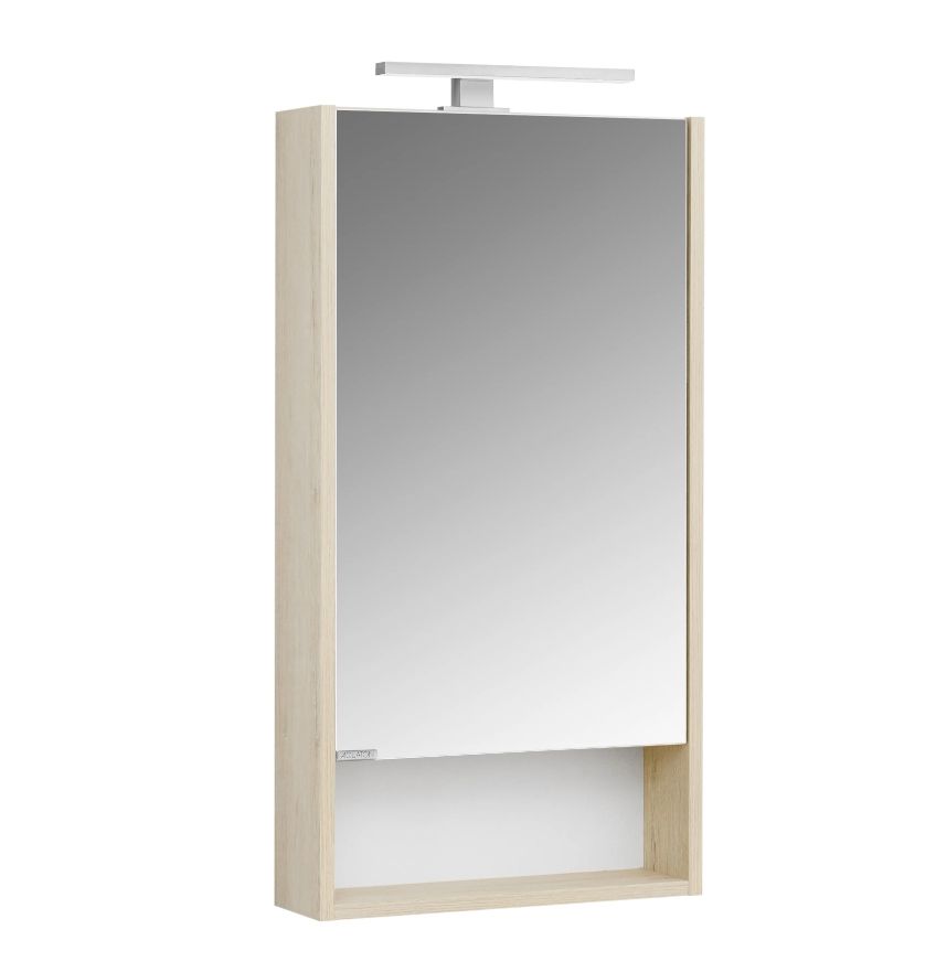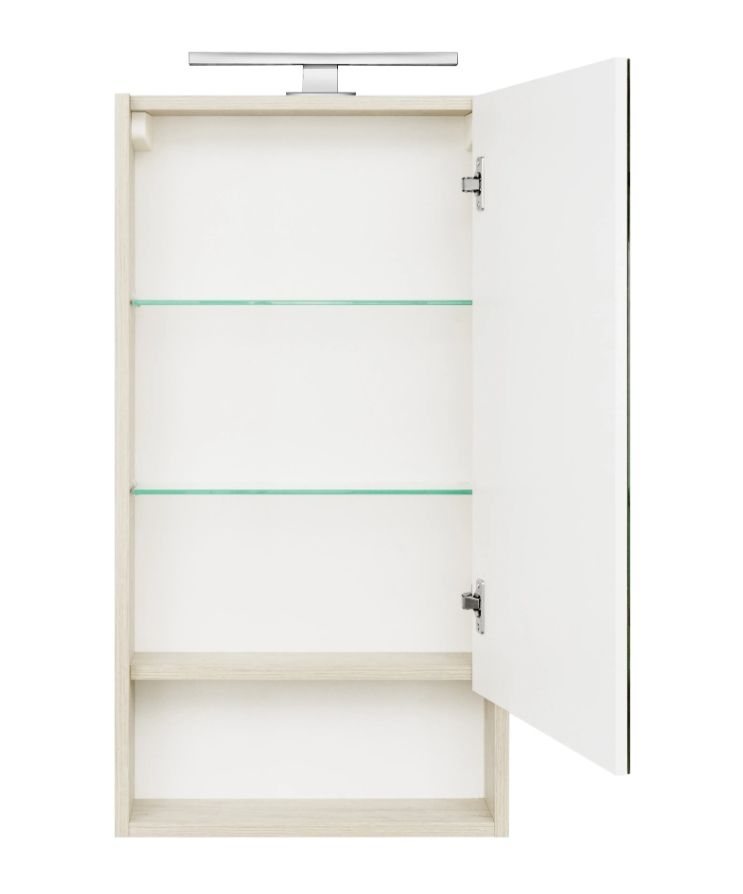 Зеркальный шкаф коллекции СКАНДИ 45 включает регулируемые стеклянные полочки за зеркальным фасадом и открытую нишу для косметических средств, которые всегда должны быть под рукой. По желанию можно дополнительно приобрести светильник Fagus.