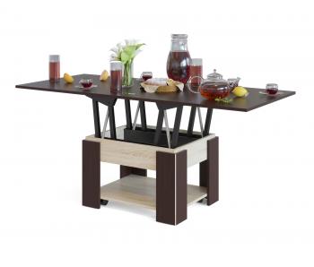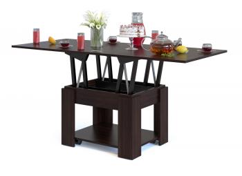 Модель предполагает не просто увеличение длины столешницы от 800 мм до 1600 мм, но и увеличение ее уровня. Таким образом, вы сможете использовать стол и как журнальный, и как полноценный обеденный стол. В сложенном виде высота стола составляет 450 мм. На нижней полочке вы сможете хранить небольшие вещи, которые всегда нужны под рукой.