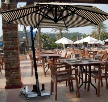 Banana – профессиональный зонт с боковой опорой из алюминия, что обеспечивает высокую устойчивость модели. Он защитит от ярких солнечных лучей и создаст приятную затененную атмосферу в частных садах, открытых летних площадках кафе, баров и ресторанов, зоны возле бассейна.