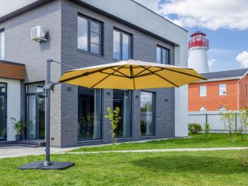 Конструкция зонта выполнена из алюминия, а подвесная опора изготовлена из прочной стали. База также сделана из алюминия и укомплектована 4мя утяжелителями — это плиты из высококачественного пластика с бетоном внутри (4 шт.), размер каждой плиты составляет 51х51х7 см. Ткань зонта изготовлена из полиэстера плотностью 200 мг и представлена в бежевом цвете.